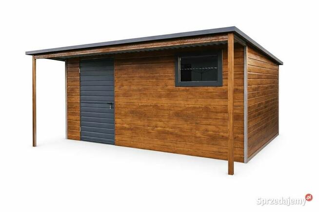 Schowek ogrodowy o wymiarach 4 m x 4 m w kolorystyce orzech wyposażony dodatkowo w wiatę drzwi i okna w kolorze antracyt. ...